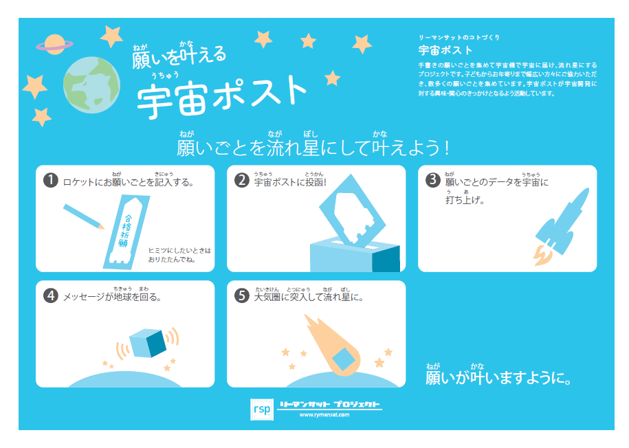 宇宙ポストは、手書きのお願いごとを集めて宇宙に届け、流れ星にするプロジェクトです。